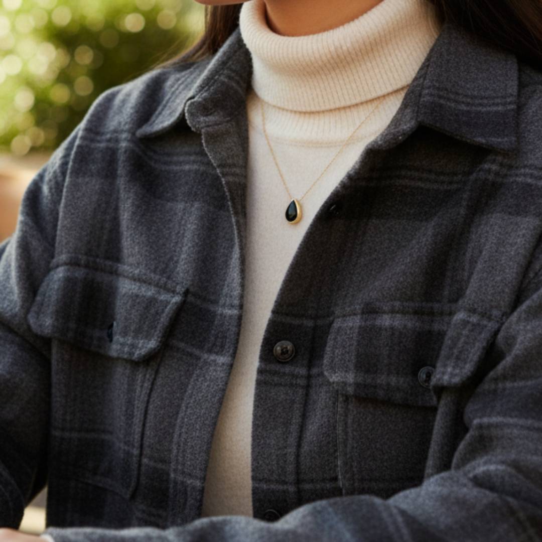 A graceful gold plated necklace featuring a teardrop shaped black stone pendant. Its sleek and minimal design adds a touch of luxury to any outfit, perfect for daily wear and special occasions alike