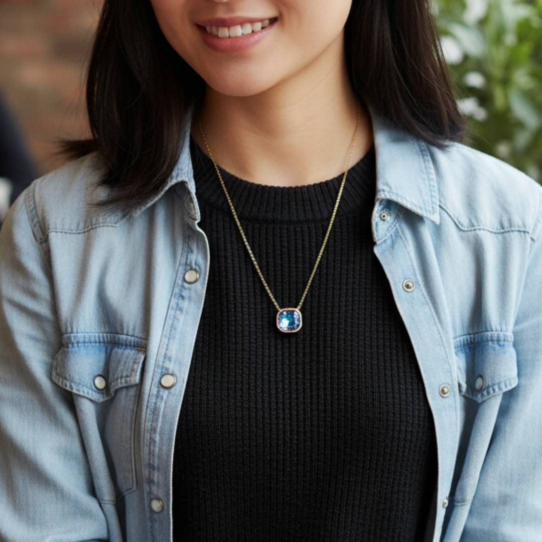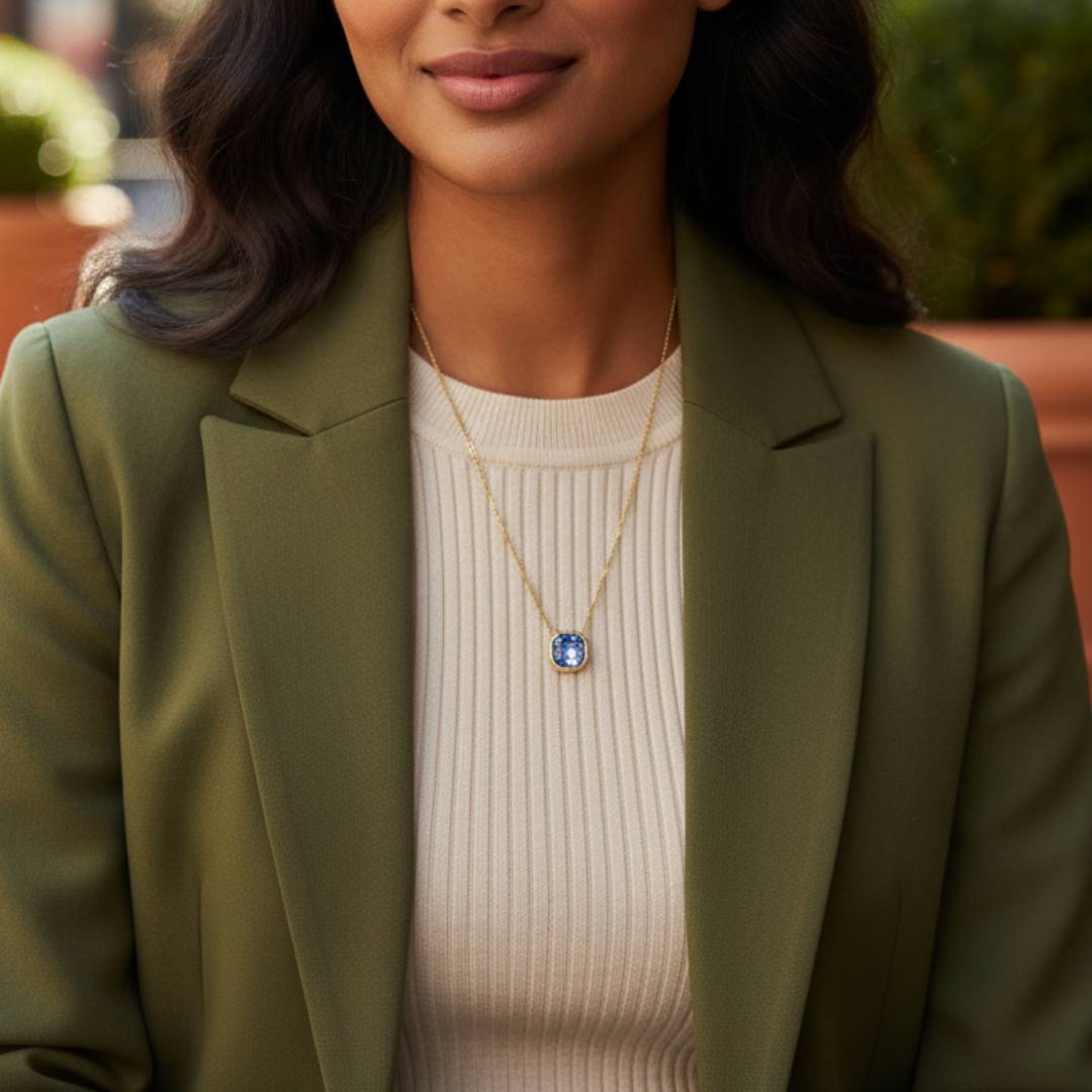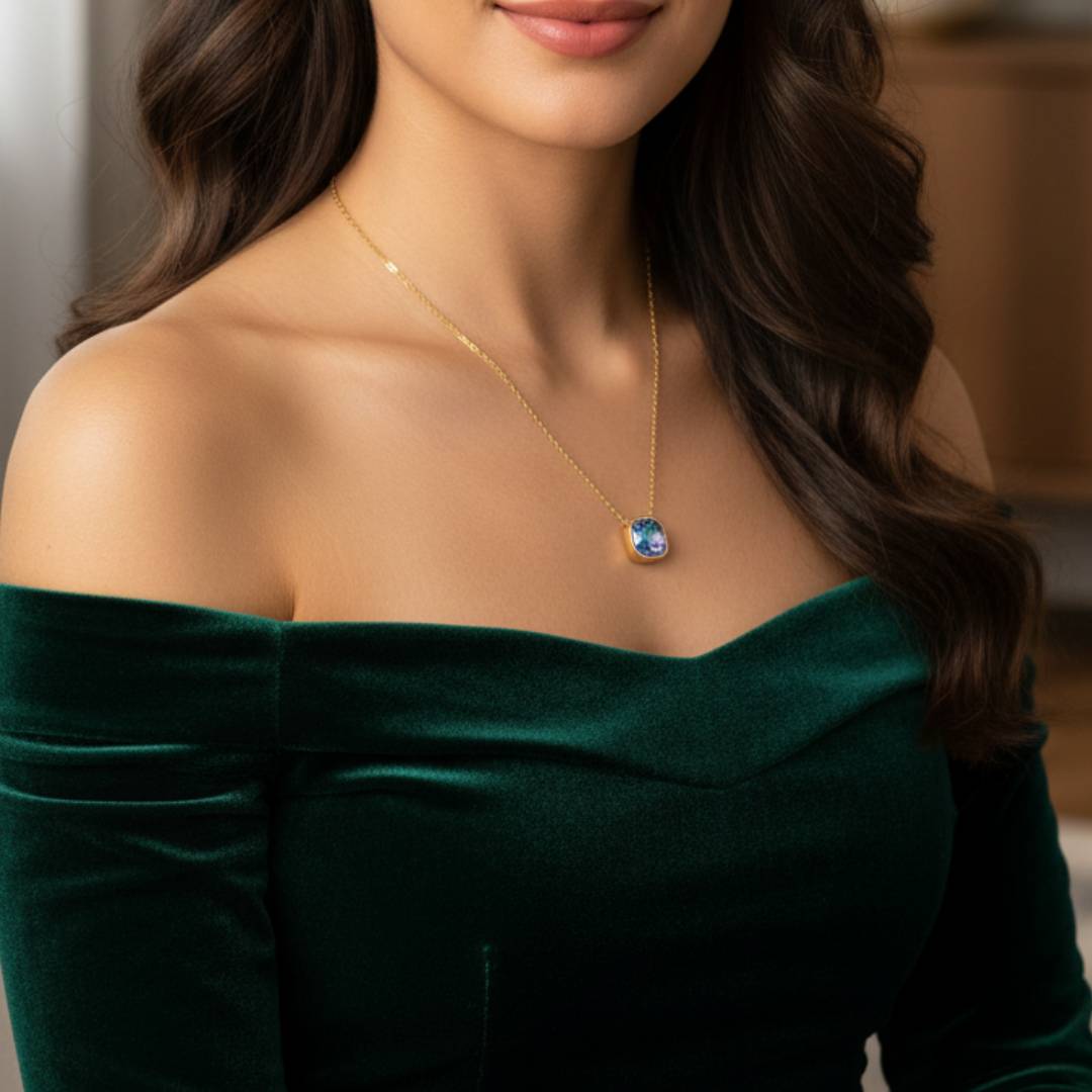 A stunning gold plated necklace featuring a square shaped blue stone with a radiant shine. Its elegant design adds a graceful pop of color, making it perfect for both casual and special occasions. Stylish, timeless, and beautifully detailed.